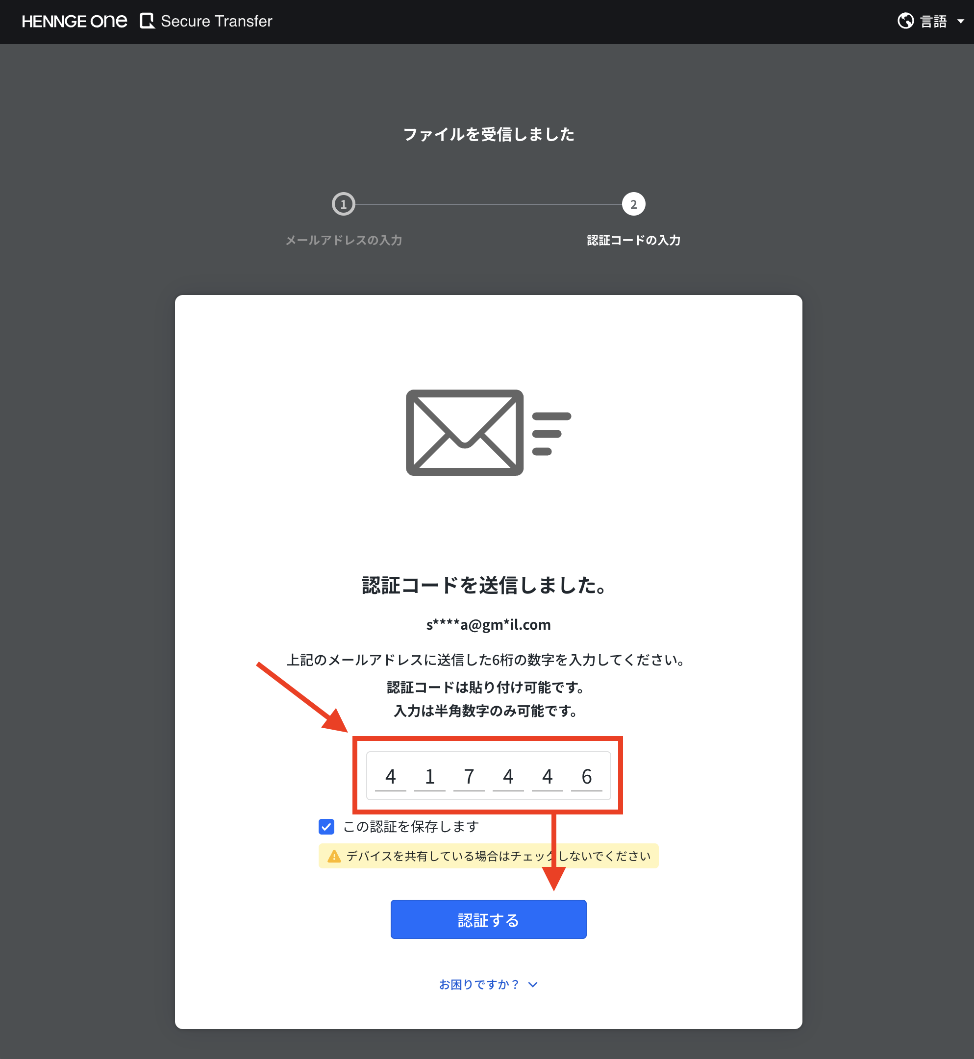 4.で受け取った認証コードを認証画面のコード入力欄に入力し、認証するボタンを押してください。