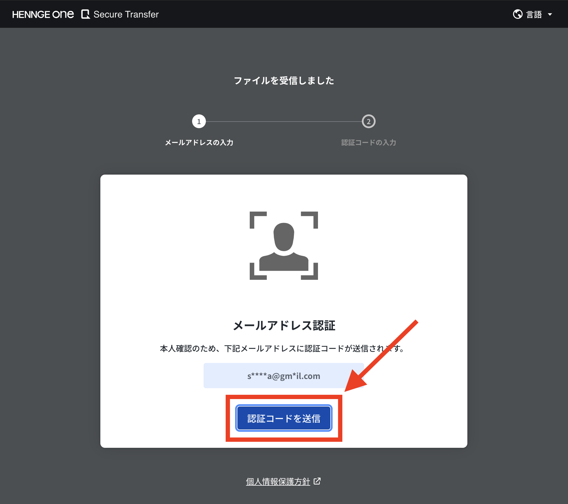 ご本人確認ページが開きますので、画面下部にある「認証コードを送信」ボタンをクリックしてください。