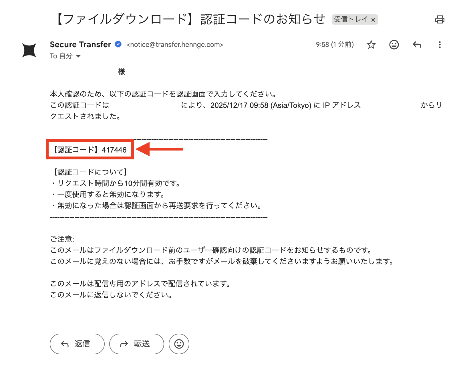のタイトルでメールが届きますので、開封して認証コードを受け取りしてください。